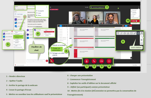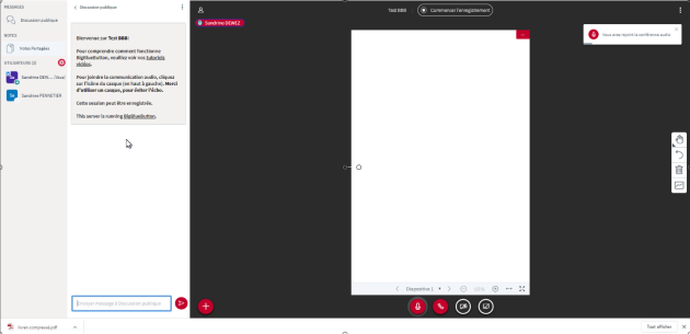 Une fois les tests audio et caméra effectués, voici les principales fonctions offertes par BBB :⚓