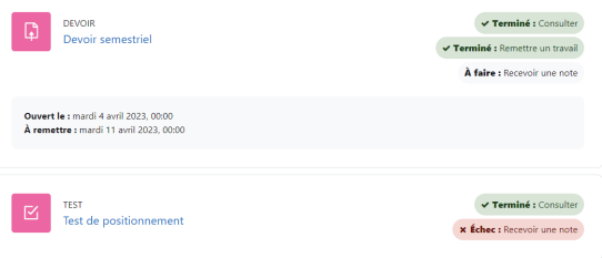 Au niveau de chaque activité ou ressource, l'état d'achèvement est signalé visuellement, à l'étudiant comme à l'enseignant :